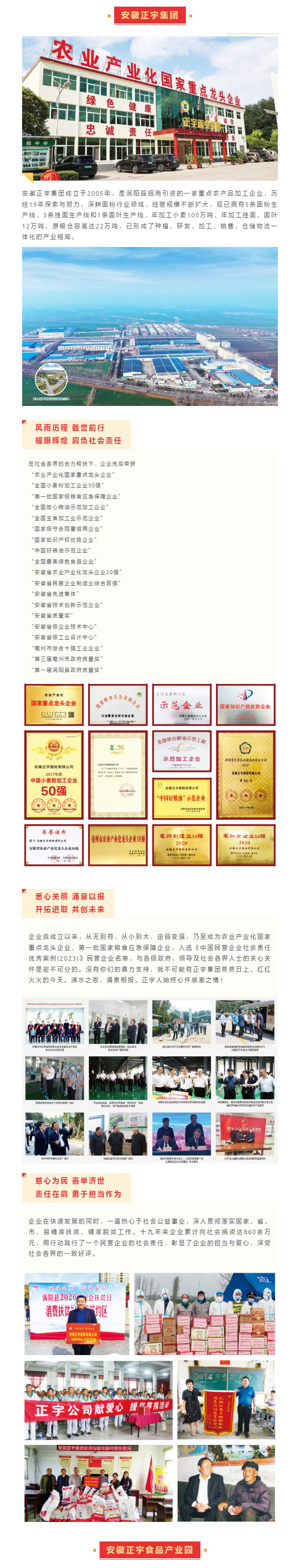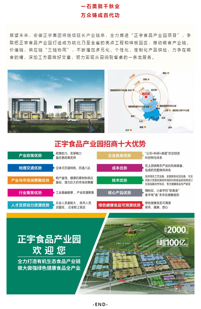 在未來的發展中,安徽正宇集團將繼續本著“立足三農、服務百姓”的根本原則,遵循“辦企一處,造福一方”發展宗旨,為耕者謀利,為食者造福,將農產品的生產、加工、銷售、服務連成一體,全面提高企業的綜合實力,努力把公司建設成為行業標桿,充分發揮連接農民與市場的橋梁作用,進一步增強農業產業化國家重點龍頭企業的輻射帶動能力,認真實施“中國好糧油”行動計劃,實現一二三產業深度融合,為渦陽縣經濟建設貢獻企業力量!為提高安徽省農業產業化發展水平,全面建成小康社會做出更多更大貢獻!